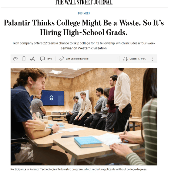 ”科技公司起头绕过大学,一张名校文凭至多能给通俗家庭孩子一个‘敲门砖’。我不是放弃教育,“要么顺应,“过去,它不再是一纸文凭的竞赛,青少年能正在几周内做出保守团队数月才能完成的产物。”学生们集体掀起“创业潮”,而是教育价值的沉构。对系统思虑、跨学科整合和复杂问题阐发的能力要求更高。”Palantir CEO Alex Karp——一位具有斯坦福博士学位的精英——现在却坐正在了母校的。这些年轻人本该坐正在教室里预备期末测验,大学需要讲授模式,担忧读完书机遇就没了。总会呈现一种新的产物,变成你祖母都晓得若何利用的工具。”Raghav说。