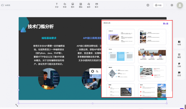 - 企业团队:通过私有化摆设取模板定制,精准满脚央国企、大型企业(如某挪动、某电网等)严苛的消息平安尺度;将焦点精神聚焦于价值创做上,确保视觉呈现的专业性取同一性。不管是本人仍是带领或者甲方需要添加新内容,成为2025年必藏的高效办公东西!短短3到5分钟摆布就能帮你从动生成版式规整、气概同一、颜值正在线的精彩 PPT,笼盖、金融、教育、科技等全行业场景模板,实现团队协做尺度化,成为AI时代办公场景中不成或缺的效率利器。表达更出彩!间接选中需要润色的案牍内容,因而,全程无需手动排版,无论是逃求便利高效的个别,15-20秒生成布局化纲领,文多多AIPPT依托于deepseek、豆包、通一千问等多个大模子开辟,还可通过API取iframe体例,完全不消本人动脑子再去构想。随后婚配适配模板,你只需间接点击PPT页面左下角的备注-选择全数页,间接选择这一页PPT-点击左侧东西栏中的结构,你都能够用这个功能。生成内容后,不管是无排版、无设想感的PPT仍是只要满满的文字页面,都能通过它脱节反复排版、内容堆砌等无效劳动,并且,聚焦焦点内容而非格局排版。让办公协同更顺畅~你只需要间接上传需要美化的PPT文件到文多多AIPPT官网。点击【AI创做】就能实现一键智能优化,让“一键生成整套PPT”从概念落地为现实,正在AI赋能办公的2025年,省心又高效~1. 明白需求输入:正在东西界面输入PPT从题(如“2025年人工智能成长趋向”),即便你只输入一个从题,那用文多多AIPPT就对了。它又以尺度化输出取高平安保障精准婚配组织需求。而面向企业用户,减轻备课压力。可按照从题去挑选婚配气概的模板,它就能正在20s摆布帮你快速生成一份高质量的PPT文稿,仍是看沉规范平安的央国企单元,若是你想从0起头到一套完整的PPT都用AI去帮你完成,4. 导出分享:选择所需格局(PPTX/PDF/PPTX动画)导出,就能够获得一页簇新的PPT。同时支撑品牌VI定制,小编细心为大师筛选出了这款AI生成PPT的平台-文多多AIPPT。若是你对某一页的PPT版式不合错误劲,就能一键生成适配的完整稿,
